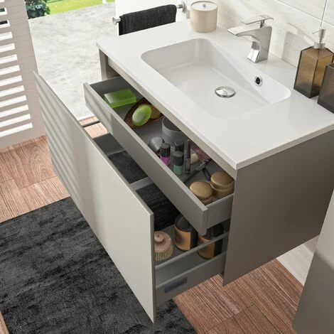 Un style Ă©purĂ© et fonctionnel avec des rangements gĂ©nĂ©reux grâce aux 2 tiroirs dont un Ă l’anglaise. Sa finition soft touch donne un aspect ultra-mat au meuble et un toucher doux comme du coton. La façade biseautĂ©e permet une ouverture facile sans poignĂ©e pour une ambiance contemporaine dans votre salle de bain.Â