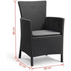La chaise a des accoudoirs confortables et un dossier de forme ergonomique pour un grand confort d’assise. Un oreiller assorti est inclus. Cette chaise de jardin confortable est fabriquĂ©e en plastique rĂ©sistant Ă l’usure, aux intempĂ©ries et sans entretien. Ainsi, elle durera des annĂ©es sans s’user ni rouiller. Avec un design contemporain, la chaise de jardin conviendra Ă tout ensemble de mobilier de jardin ou table d’extĂ©rieur.